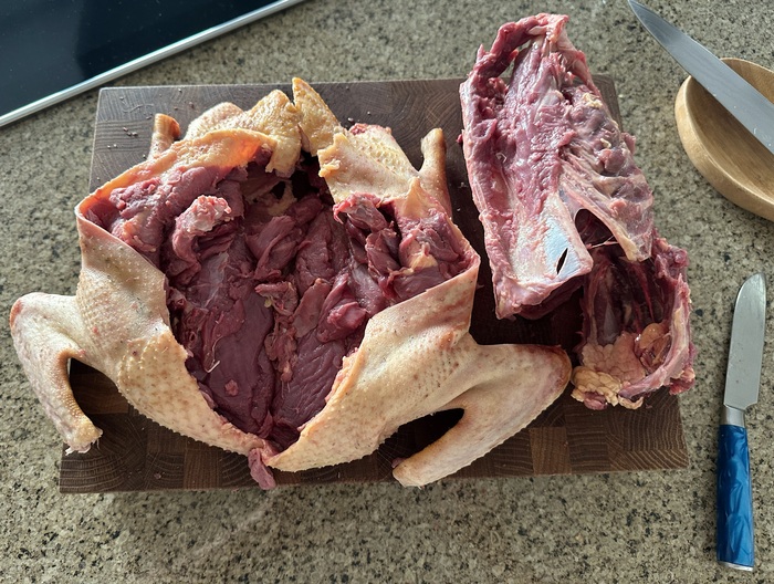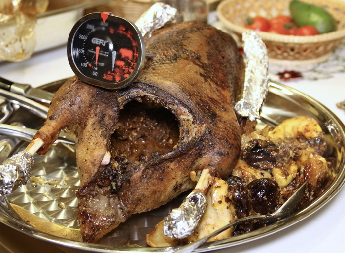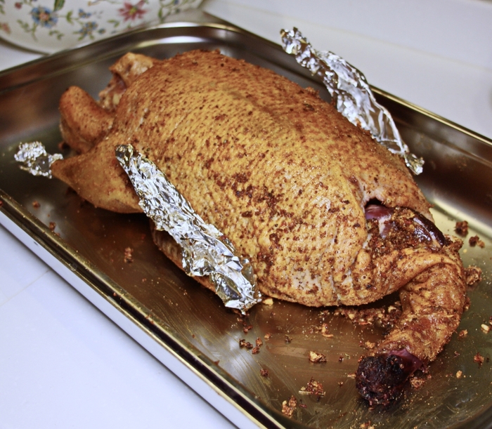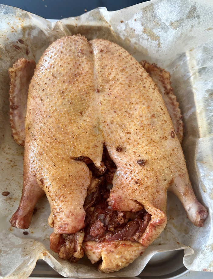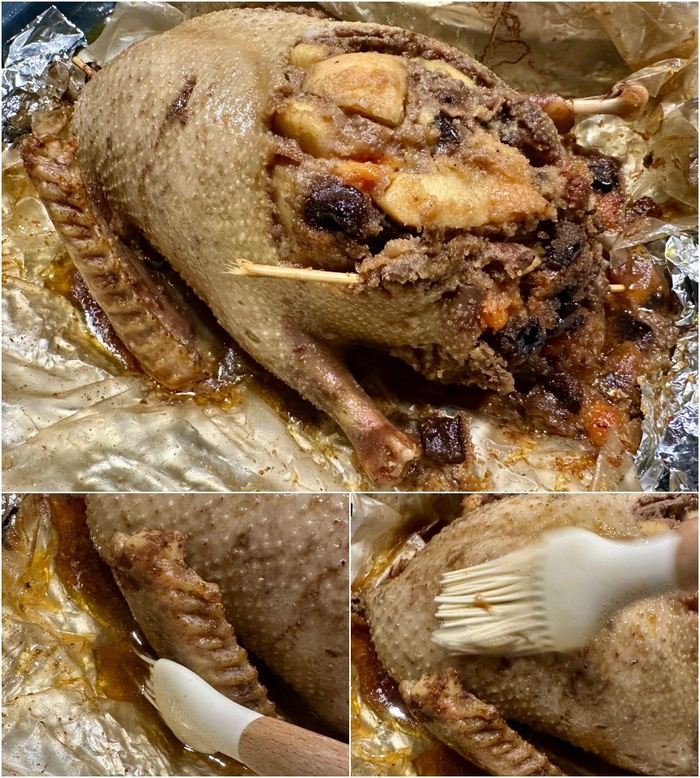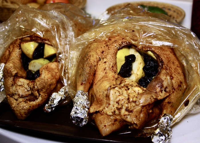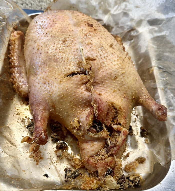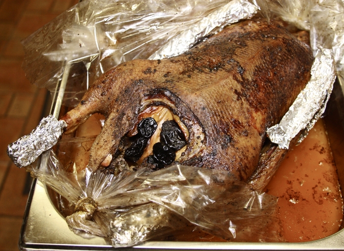 Так вот, было рекомендовано раскрошить пару пряников и добавить в начинку, чтобы эта крошка, значит, связала внутренние соки утки. Не дала им вытечь.