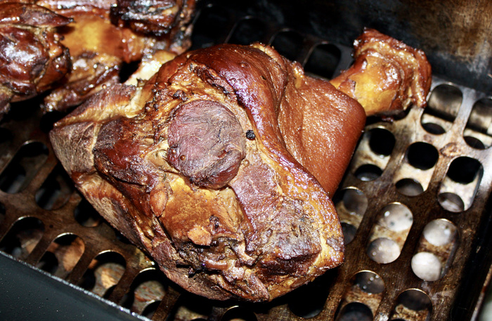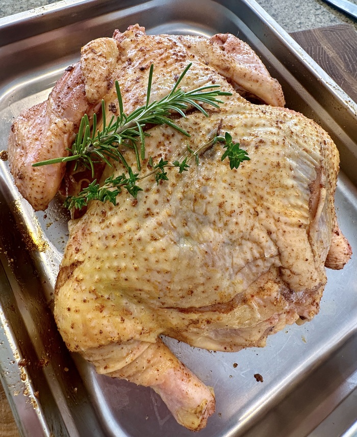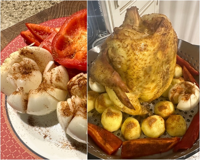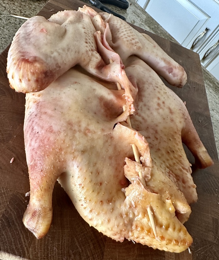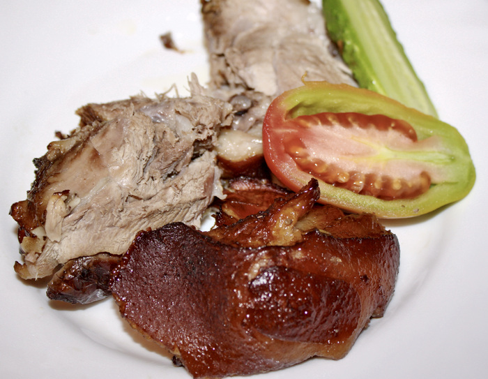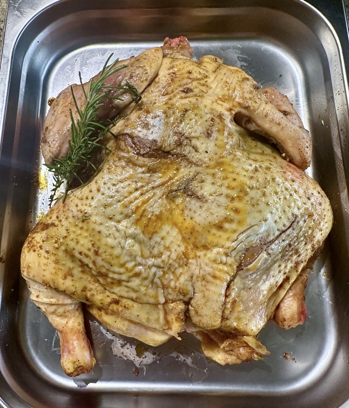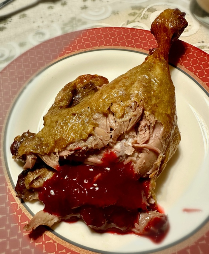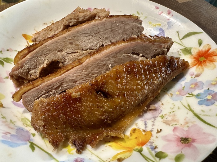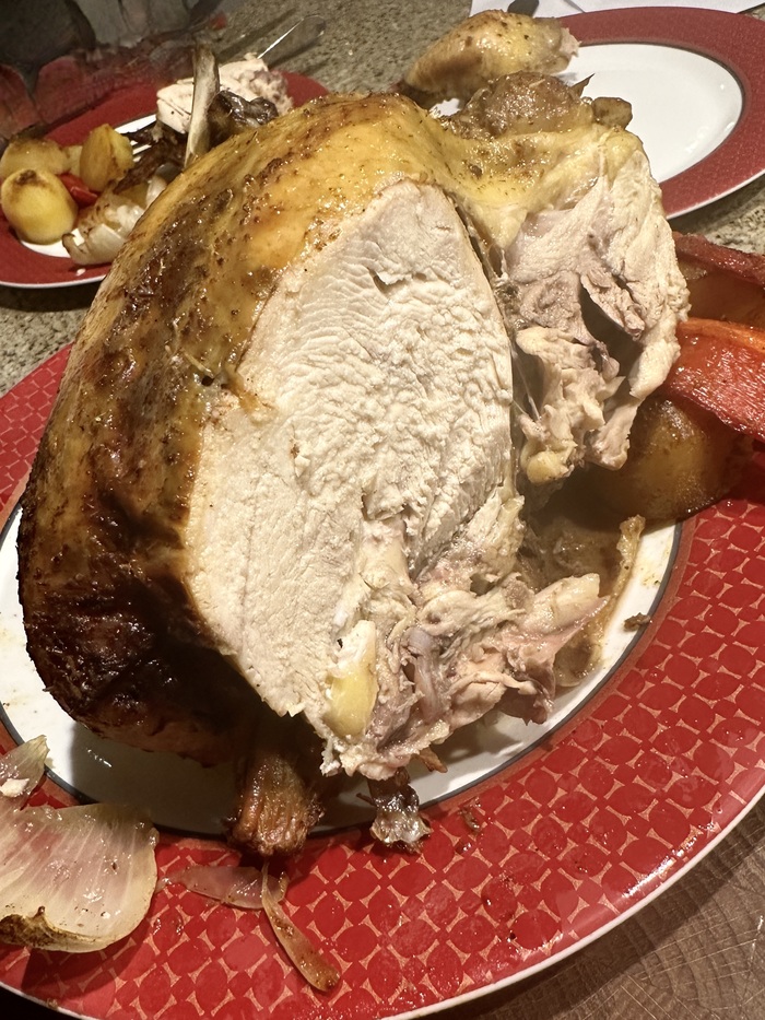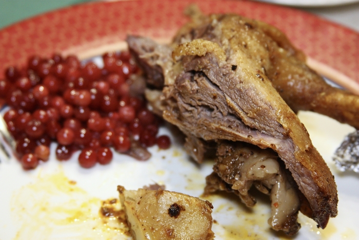 В остальном получилось всё так, как хотелось. Хорошо прожаренное мясо. Птицу удобно нарезать. Похрустывающая кожа.