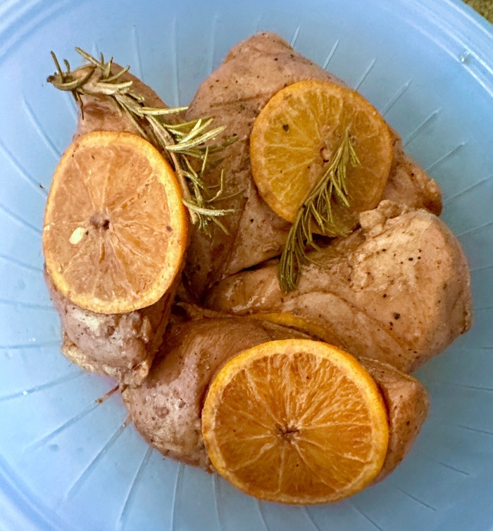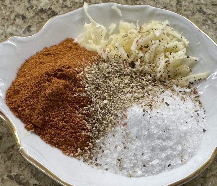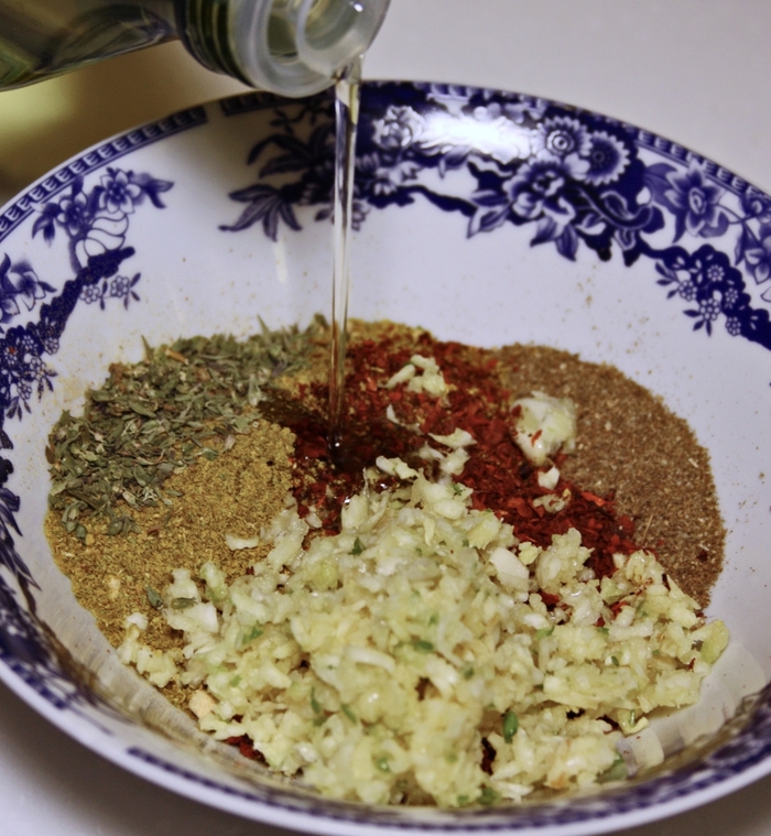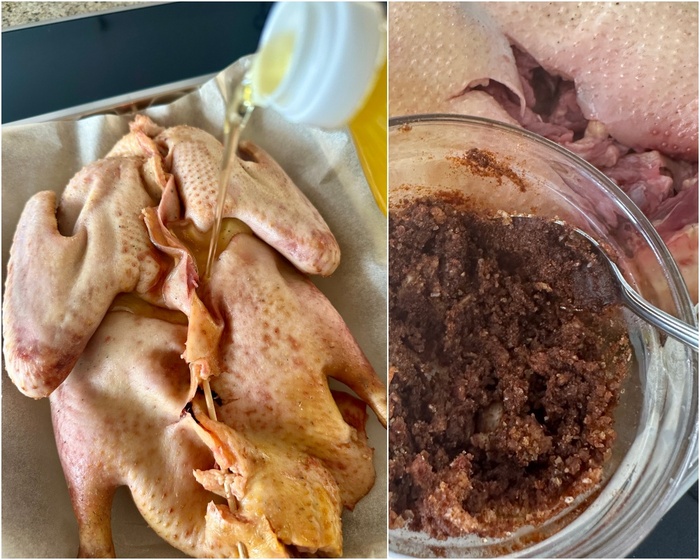 Маринад? Смесь для посола? Да, в общем, не в названии дело. Для мастырки, которой тушку надо будет натереть, я взял. Соль (вес обесскелеченной тушки – 1700 гр) 30 граммов. Чеснок – два довольно больших зубчика потер на терке – примерно 10 граммов. Паприка молотая – две чайных ложки «с верхом». Перец чёрный и душистый дробленая смесь – половина чайной ложки. Ложка масла растительного, чтобы смешать.