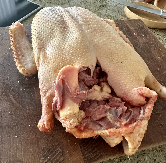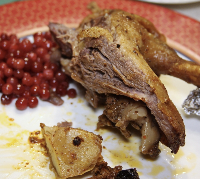 Начинка, увы…, вся ушла в отходы. Сухарики свое дело сделали. Защитили яблоки от впитывания утиного жира. Получилось невкусно-деревянно.