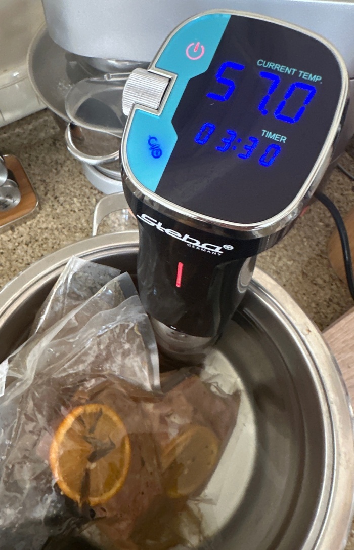 Утку Илья Исаакович «просто» выложил в лоток и жарил в открытом виде. Полтора часа при 120 градусах. Режим «нагрев верх и низ». Что-то меня смутило, если честно, поэтому я сделал немного не так.