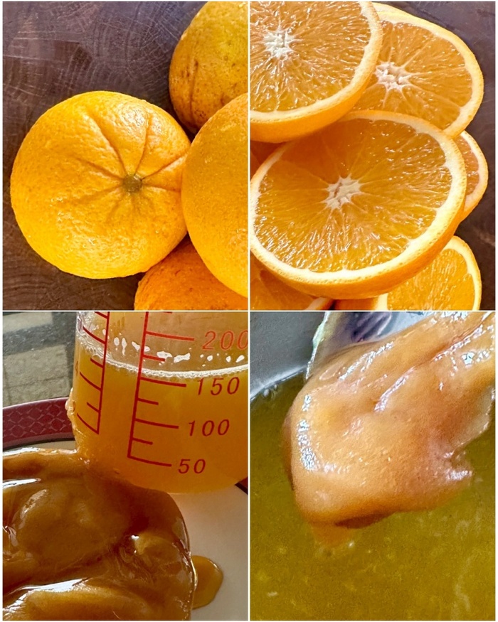 На 150 граммов сока взял полторы ложки мёда. Сначала на сильном нагреве довел практически до закипания. Нагрев сразу же уменьшил. Мед очень хорошо размешал и потом глазурь выпаривал. Тут не сколько «погуще» добивался, а чтобы вкус стал сладко-ароматно-апельсиновый. Без кислоты и горечи.
