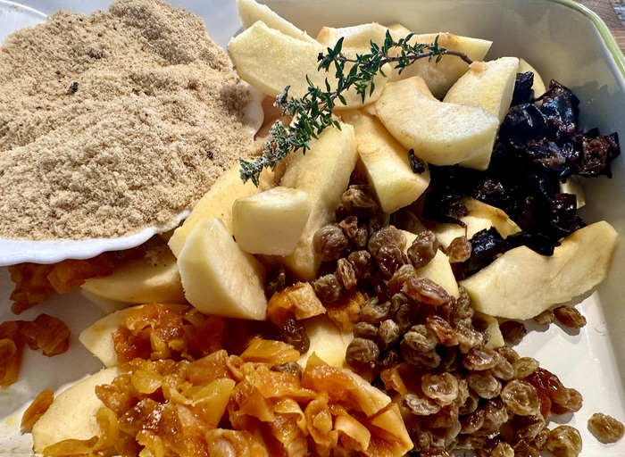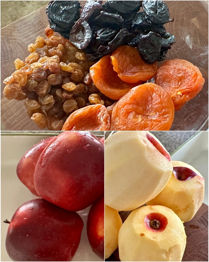Начинка. Сухофрукты. Тут, конечно, вариативно. Но чернослив, курага и изюм создадут вполне себе приемлемый ансамбль.