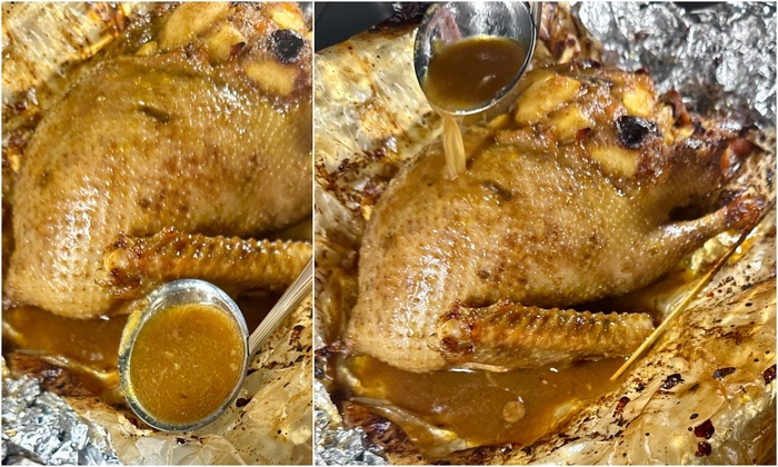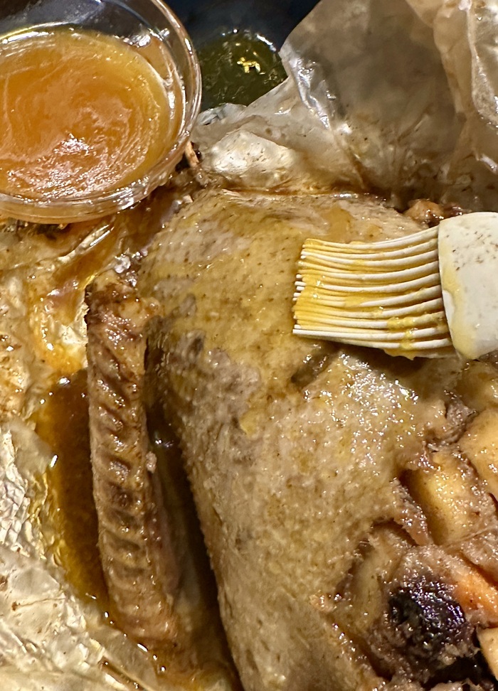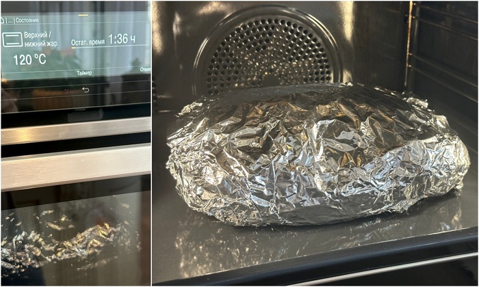 Жирку, правда, немного вытопилось. Ну обмазал я им тушку, снова фольгой обмотал и отправил в духовку на час сорок пять, уже при температуре 180 градусов.