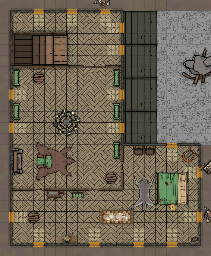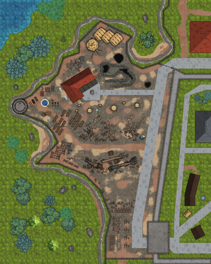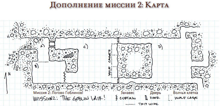 За лагерем гоблинов расположена пещера, оканчивающаяся обрывом (зона 3). В зоне 6 расположен склад дров, используемых гоблинами для лагеря и свалка различных (по большей части тухлых) овощей и фруктов. Интеллектуально подкованные персонажи (интеллект Сл. 13) могут догадаться, что гоблины не особые любители такого типа еды, следовательно, это корм для овец, находящихся в загоне в зоне 5. Также в зоне есть тотем, перед которым у костра приключенцы встретят шамана племени (у меня это был колдун 3-го уровня). На его глазах будет повязка, будто он слепой. Опишите это. Достаточно проницательные (Сл. 16), либо внимательные (Сл. 16) персонажи могут понять, что повязка бутафорская, и гоблин всё отлично видит. Для поддержания своего образа он не участвовал в битве в зоне 5, но явно не доволен, что его племя перебили.