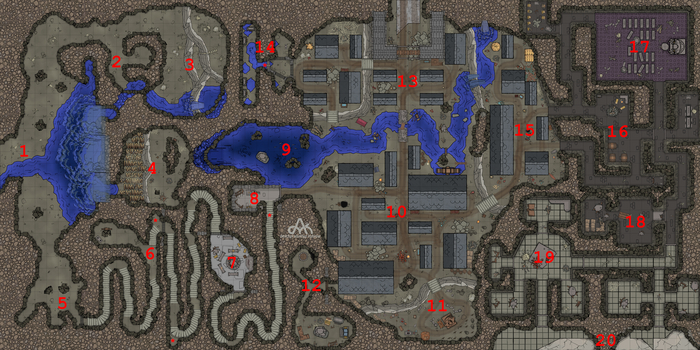 Река пересекает карту с севера на юг. Скорость реки очень высокая, река глубокая, что представляет смертельную опасность для персонажей. Обрыв с Западной стороны составляет 700 футов (чуть больше 213 метров), поэтому падение с этой высоты также смертельно опасно для персонажей малого уровня.
