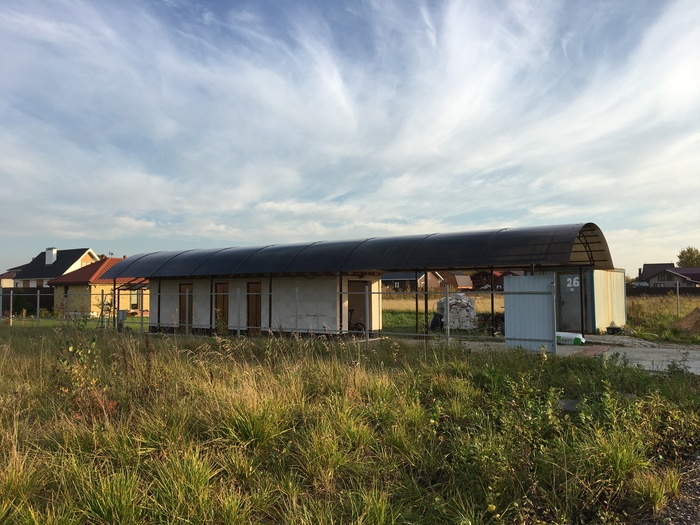 Длина 18 метров, ширина 4,5 м. 80 м2 накрытой площади. Под навес умещается 1,5 машины).