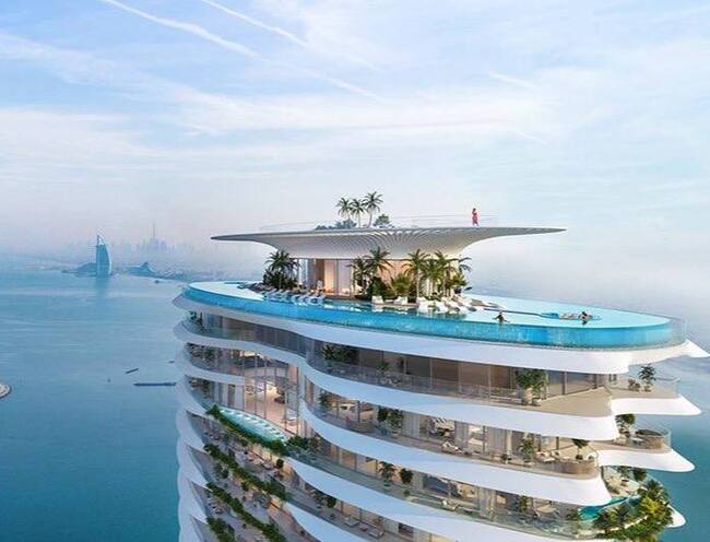Внутри будут квартиры от 2 до 6 спален с ремонтом премиум-класса, а цены начинаются от 21 млн дирхамов. На крыше комплекса будет ландшафтный парк и панорамный бассейн.