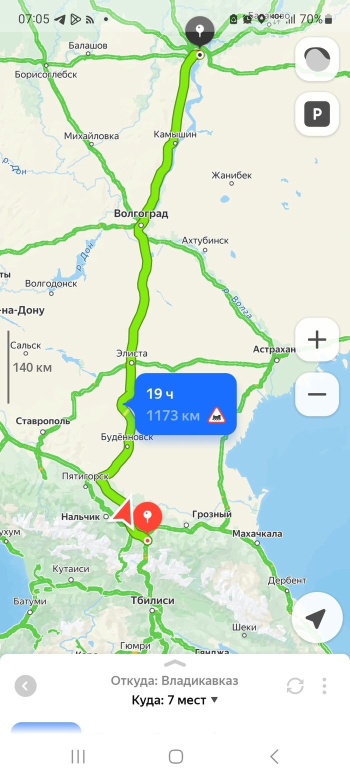 Итак, утро после ночёвки во Владикавказе принесло ряд неприятных сюрпризов. Мы планировали встать в 4 утра и выехать соответственно в пять, как мы до этого сделали в Ереване, но коварный телефон сменил часовую зону на московскую. Таким образом, мы встали не в 4 по Еревану, а только в 5. Завтрак и утренние сборы продлились до 6:30. И заметил я, что ориентируемся мы не на ту часовую зону непосредственно перед выездом. Дело в том, что в Саратове тот же часовой пояс, что и в Ереване. Соответственно при пересечении границы Саратовской области нам автоматически будет нужно прибавить один час к текущему времени. То есть, грубо говоря, мы потеряли около полутора часов на ровном месте, а впереди нас ожидало примерно 1200 километров пути.