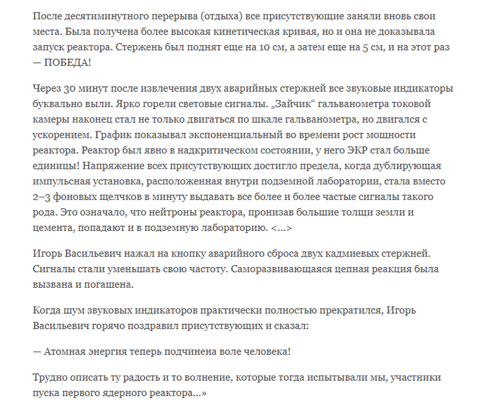 Как я уже писал, первая авария случилась чуть ли не сразу после выхода ректора на проектную мощность, реактор был остановлен, ликвидация аварии заняла несколько дней. Вторая крупная авария случилась уже через несколько месяцев, началась массовая протечка труб. Эксплуатировать реактор стало невозможно, и 20 января 1949 года Курчатов остановил его на капитальный ремонт, чтобы заменить каналы, но сохранить при этом все ценные урановые блочки. Ликвидация этой аварии, заняла уже гораздо больше времени и ректор был запущен только в марте месяце.