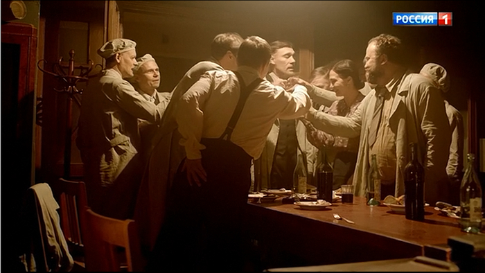 Дальше все садятся за стол, на столе стоит море выпивки, Ванников произносит тост за успешные испытания, которые должны состоятся уже завтра. Рубин кричит УРА, все этот крик подхватывают, после чего дружно выпивают.