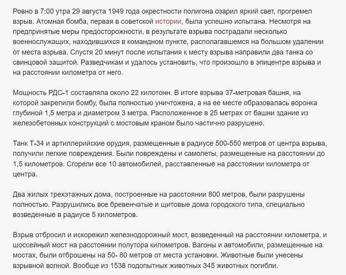 Советское руководство интересовалось, какими будут последствия ядерного взрыва для объектов инфраструктуры, для военной техники. Поэтому в зоне испытания были построены отрезки тоннелей метро, взлетно-посадочные полосы. Разместили на полигоне и отдельные образцы танков, самоходных артиллерийских установок, ракетных установок, самолетов. В центр опытного поля поставили специальную металлическую конструкцию – башню высотой 37,5 метров, на которой закрепили бомбу РДС-1.