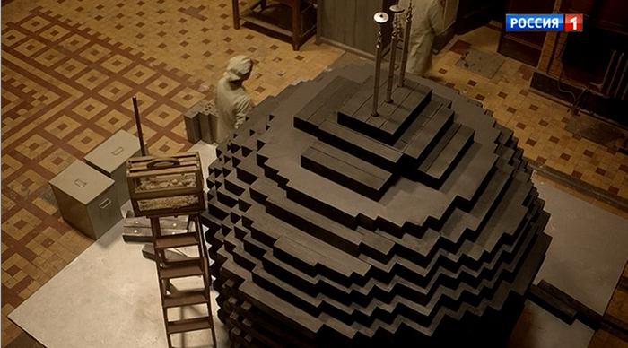 В следующей сцене, чекисты заносят в помещение два контейнера, после чего уходят. Рубин открывает контейнер и достаёт оттуда урановую полусферу, которую устанавливает на специальное устройство для испытаний, вторую полусферу подвешивают на кране, после чего звонит Курчатову и сообщает что они готовы.