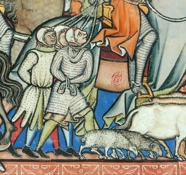 Согласно закону 1318 года люди, чье имущество оценивалось более чем 10 фунтов должны были носить акетон (стеганый доспех), бацинет (шлем) и латные рукавицы. Или же второй вариант шлем, хауберк для защиты груди и шеи, а также железные перчатки. Тем, чье имущество оценивалось в одну корову, предписывалось иметь копье или лук (исходя из конкретных навыков) и на этом все [17]. Для знати и рыцарей, понятно требования были выше.