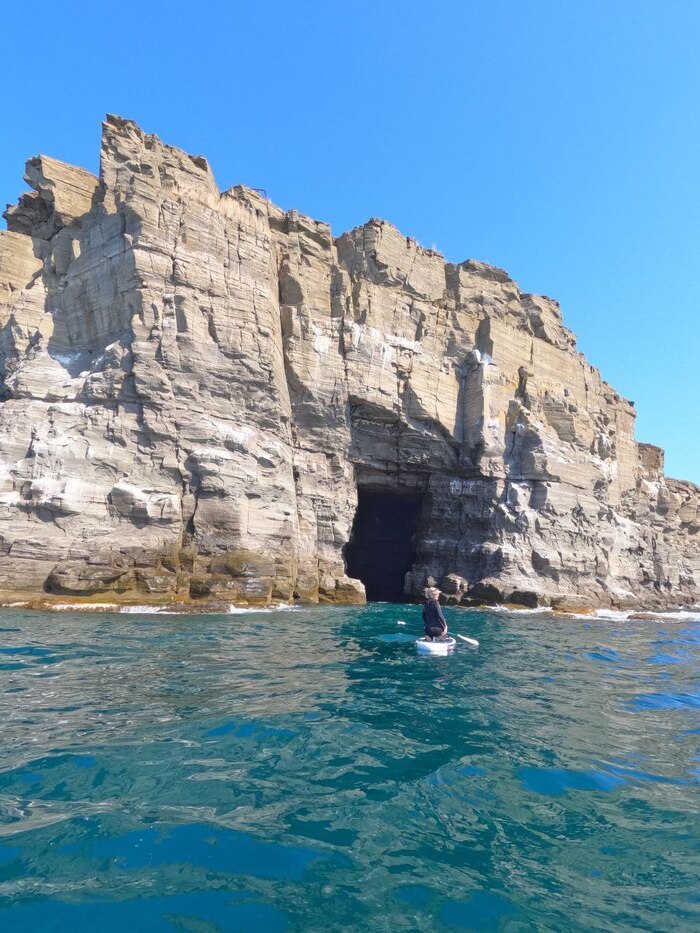 Сверху можно взглянуть на морскую гладь с высоты отвесных скал, а, спустившись по веревке на берег, можно увидеть интересные кекуры и гроты.