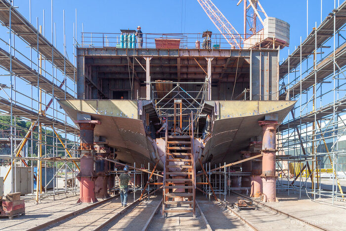 Готовые секции судна стыкуются между собой. Здесь начинаешь понимать, насколько в реальности суда большие.