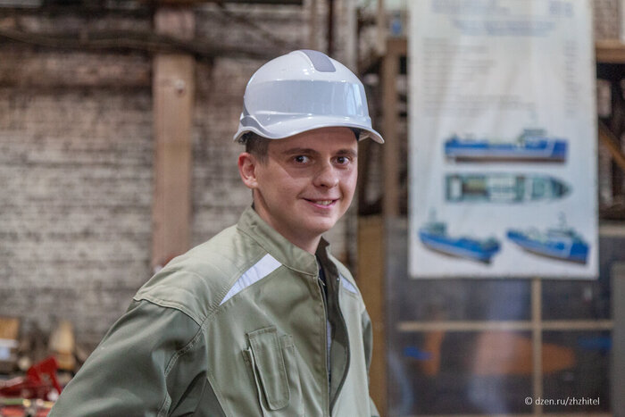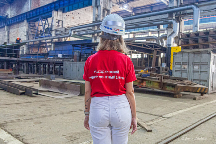 Обращаю внимание, что на заводе работает немало молодежи. Находкинский судоремонтный завод — градообразующее предприятие. За спиной рабочего виден плакат с самым главным для НСРЗ заказом.