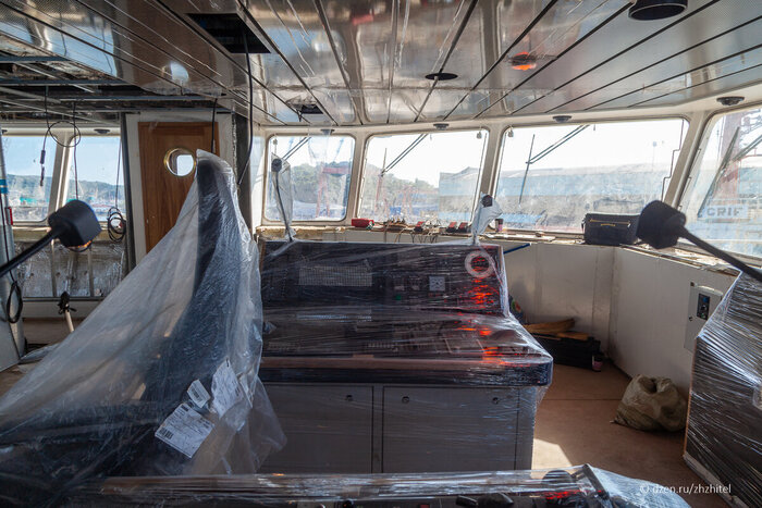 В рубке краболова просторно и комфортно. Стекла наклонены, как на диспетчерских вышках в аэропортах. Это убирает блики и улучшает обзор. Установленное в рубке оборудование заботливо укрыто полиэтиленовой пленкой.