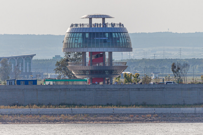 Про мост между Россией и Китаем на Пикабу я уже рассказывал, поехали дальше. Смотрю правее моста, вижу на китайской стороне колесо обозрения, многоэтажки вдали, суда у берега, трубы и вдруг замечаю российский триколор, реющий над Китаем. Сначала подумал, что мне почудилось.