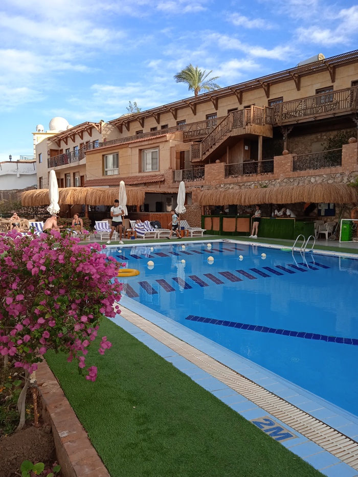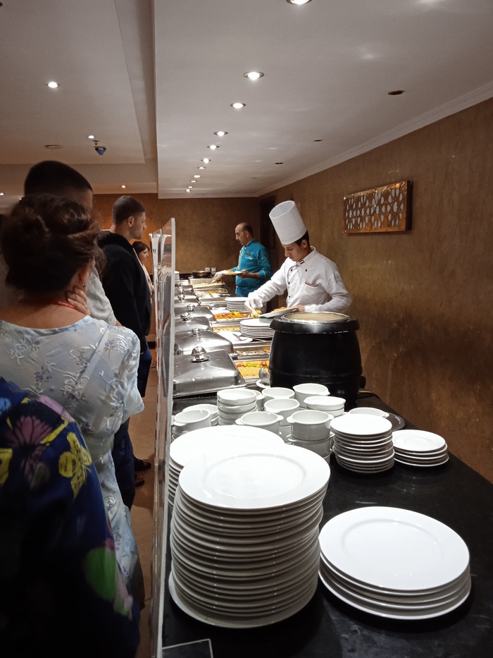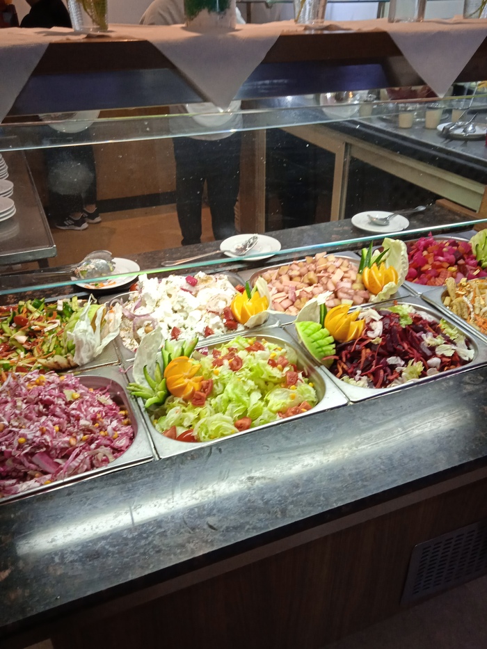 Все приемы пищи проходят в формате шведского стола. Завтрак нормальный: есть каши, яйца, всякие нарезки из сыра и колбасы, овощи-фрукты, сосиски, блинчики и прочая выпечка. На обед и ужин давали несколько видов салатов, курицу, мясо, рис, макароны, картофель на гарнир. Если едете на неделю, то нормально, а если подольше, то надоест — ассортимент изо дня в день особо не меняется, и вкус у блюд не ресторанный, а скорее "столовский". Но все свежее, никто не отравился.