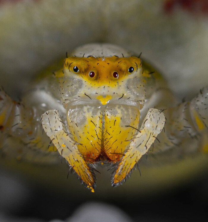 Один из моих любимых кадров. В основном из-за того, как прекрасно свет от вспышки «пробил» бульбусы на педипальпах беспозвоночного. Во время макрофотоохот на живых моделей особо не развернёшься с постановкой цветов и фонов. Все силы уходят на то, чтобы подобраться с нужного ракурса и не спугнуть.