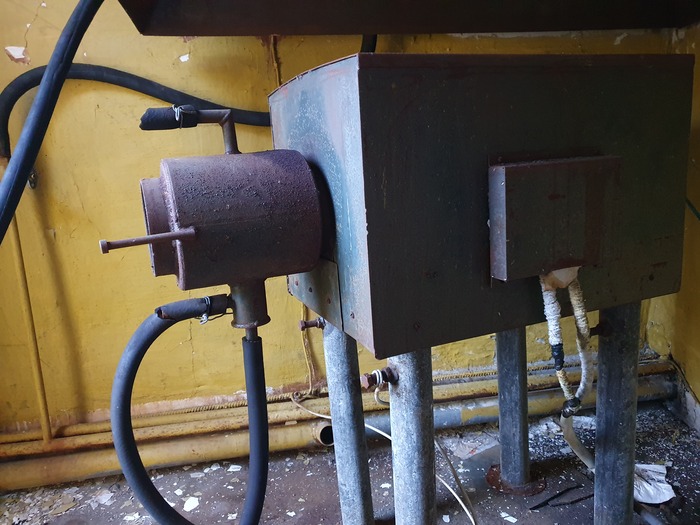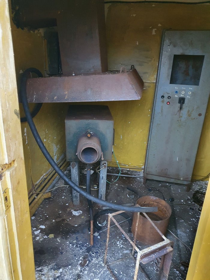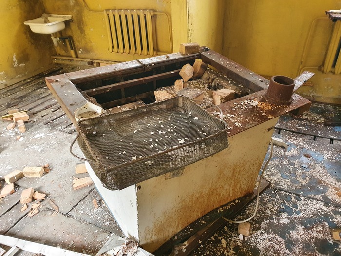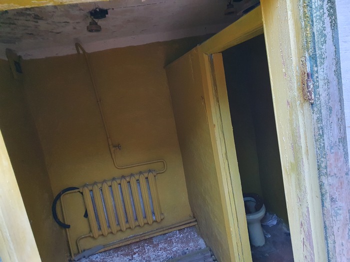 Левая дверь – душевая и уборная. Унитаз!! Похоже, выйти из этого помещения в течение рабочего дня был тот еще бюрократический геморрой. Слева с торца здания отделение отпарки амальгамы, но об этом было в предыдущей публикации.
