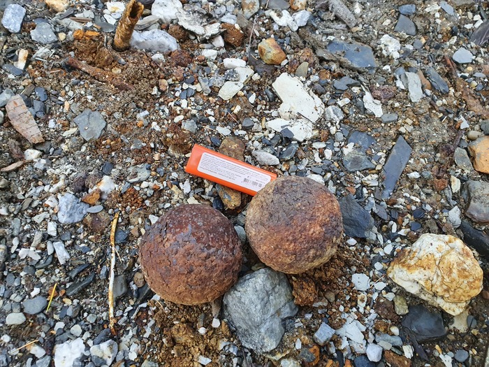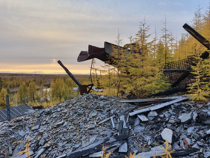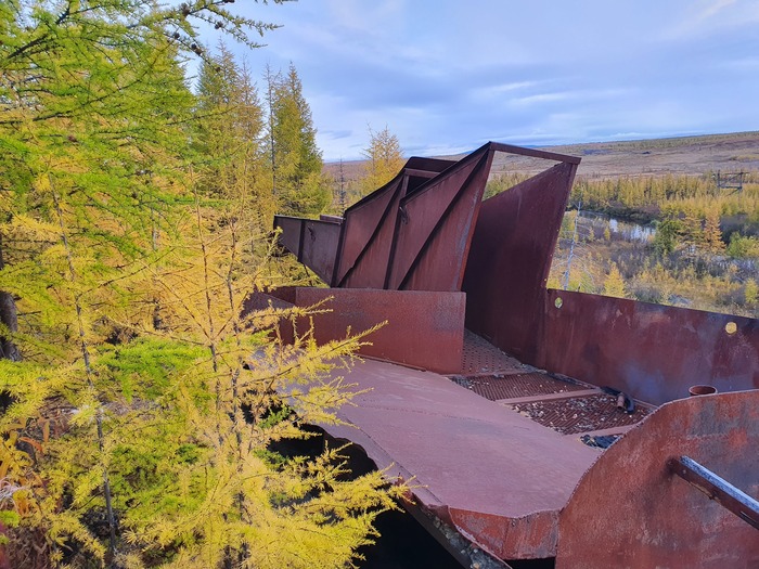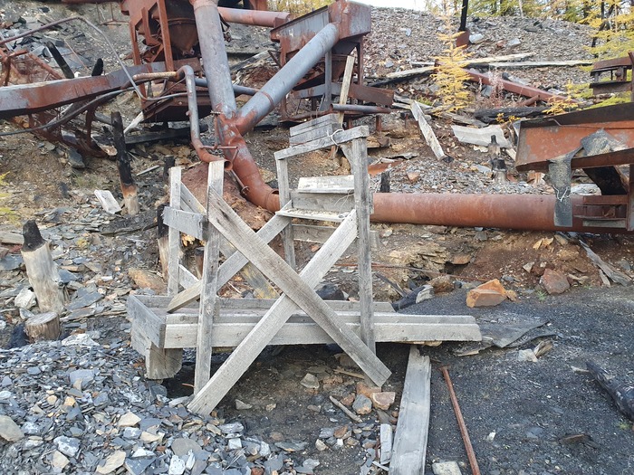 У подножья склона на свайном же основании установлена небольшая шаровая мельница. Шары тоже в наличии. Вероятно, в надрешетном концентрате было много сростков золота с кварцем. Материал вместе с шарами загружался в барабан. Загрузочное отверстие задраивалось, какое-то время все это крутилось, измельчалось, потом разгружалось и вместе с концентратом столов поступало на доводку в расположенные ниже помещения ЗПК-ДОУ (уже под крышей).