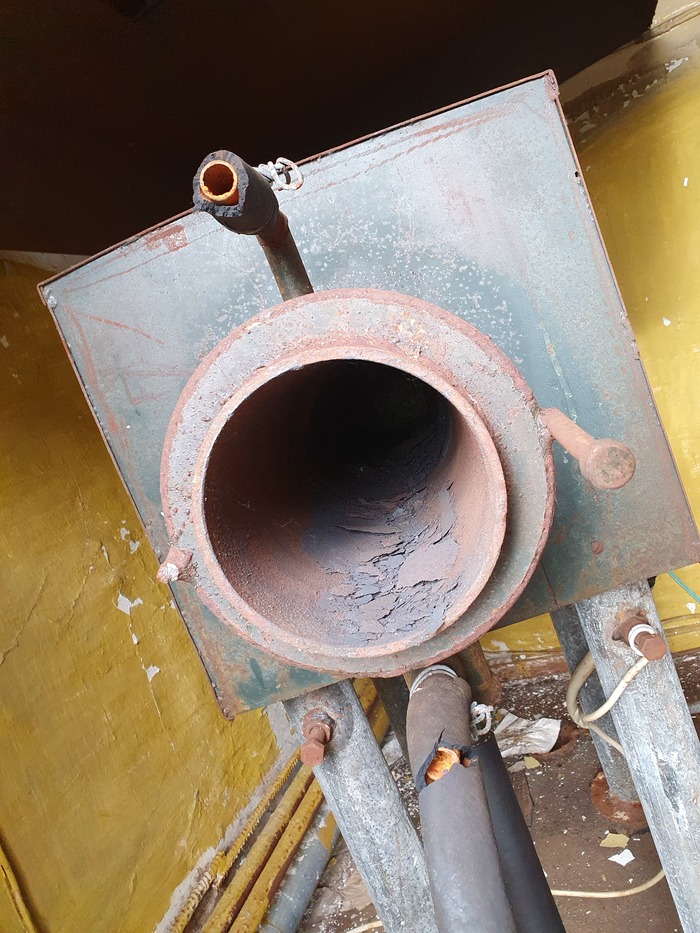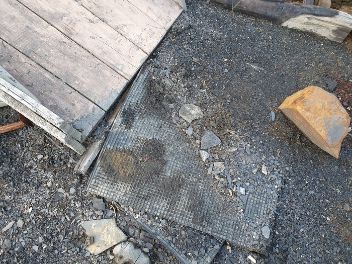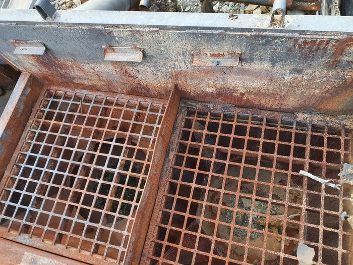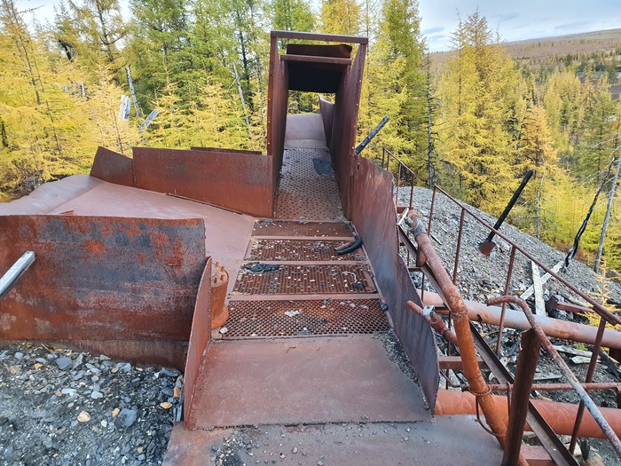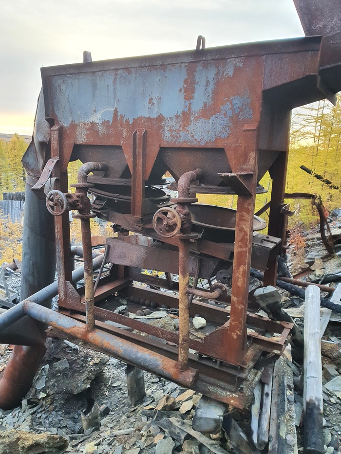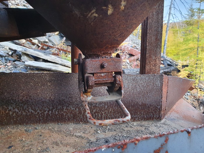 Дальше на бровке обрывистого склона приемный бункер, куда каким-то образом высыпался концентрат из концентратовоза. Вообще-то, если меня глаза не обманывают, это переделанный размывочный стол промывочного прибора ПГШ-30, в котором перфорация на 100 мм заменена перфорацией на 30 мм.