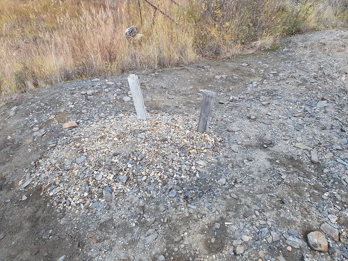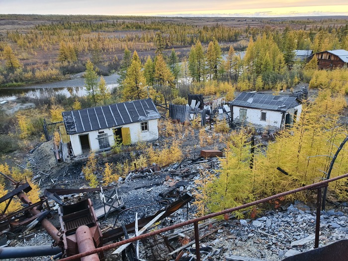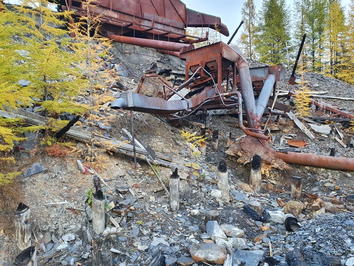 Сверху от электростанции к ДОУ идет отсыпанная дорога, уже прилично заросшая молодыми листвяшками. Золото в россыпях прииска было достаточно мелкое, поэтому сполоск улавливающих шлюзов промывочных приборов осуществлялся без доводки золота на ковриках. Т.е. весь материал, что накапливался на шлюзе (а это 2-3 кубометра с каждого прибора в сутки) смывался в спецконтейнер и вот по этой дороге концентратовозом привозился на доводку.