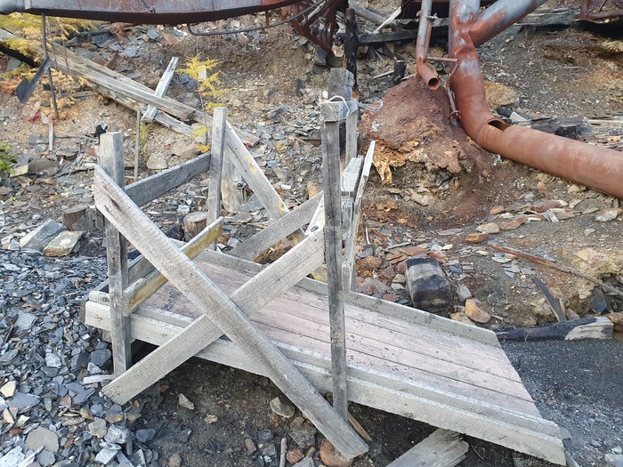 Подрешетный концентрат машинок самотеком по желобам подавался на два больших концентрационных стола СКО-7,5. Столы были установлены на деревянных сваях. Остатки свай стоят на месте.