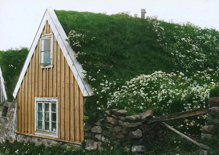 Со времён заселения Исландии (IX–X века) строительные материалы были дефицитом. Дерево доставляли с трудом, камня хватало, но нужна была изоляция от холода, ветра и дождей. Решение нашли простое и гениальное: каркас дома покрывали деревянными или каменными плитами, сверху укладывали слой дерна (толстый пласт земли с корневой системой). Трава естественно прорастала, создавая живую, тёплую крышу.