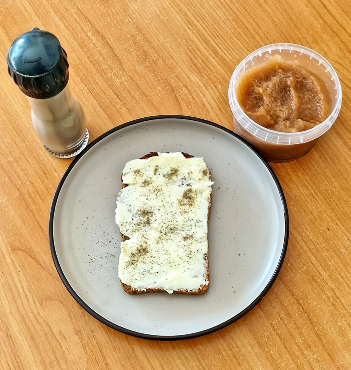 Кисло-остро-солёный взрыв на вкусовых рецепторах — а ничё так, годнененько. Только много так не съешь, а мне ещё пару кружков кабачка надо заточить. Снова посыпаем кабачок адыгейской солью, а топингом у нас будет… хрен нам будет топингом. Столовый.