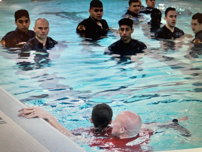 А неделей раньше был экзамен с симуляцией настоящей ночной погони. Здесь, кадет был абсолютно один на один против опытного инструктора в машине— нарушителе. Все ваши действия, от переговоров и указания своего местоположения, до техники вождения — отслеживались инструкторами в машинах— помехах. Если экзамен был провален, кадету приходилось ждать пол ночи, чтобы сделать пересдачу. Слава Богу ни я, ни мой хороший друг и одноклассник — москвич, не ударили лицом в грязь и сдали это испытание с первого раза. «Спасение утопающих— дело рук самих утопающих» и знаете, есть в этом выражении часть правды, потому что плаваю я, кхм, немношк совсем никак. Ну, то есть держусь на воде только по счастливой случайности. Короче, если вы тонете, и рядом кроме меня никого нет— то знайте, что у меня в голове проносится лишь одна мысль: двое похорон завтра или одни? К чему я? Одной из последних тренировок был класс, обучающий спасению на воде, попытке создания спасательного круга из брюк или рубашки находясь в воде( я чуть не утонул только при попытке снять брюки ) правильным прыжкам в воду и прочим нонсенсам кмк. Также был сброс двоек обнявшихся и симулирующих борьбу кадетов с полутораметровой вышки вниз головой. Каким то не совсем мне понятным образом этот момент причинил несколько разбитых носов, включая мой. Как видите, мы на фото в полной форме для повышенного, так сказать, реализма. Кульминацией же этого класса стал манекен в Корвете, который каждый кадет обязан был попытаться спасти. Машина опускается на глубину три с половиной метра, и кадет проделав с десяток бурпи и войдя в затемненный по такому случаю бассейн, должен найти под водой автомобиль ну и вызволить «водителя». Сразу скажу, что честно попыхтев и поныряв выделенные мне две минуты, я даже не надеялся коснуться машины, не то чтобы кого либо из нее извлечь. Зато я раков умею из нор доставать XD