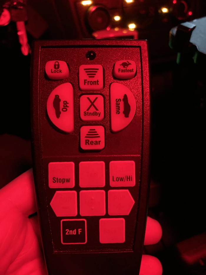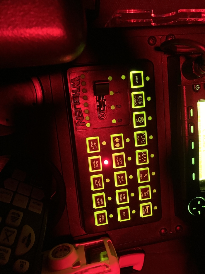 Ниже на фото- пульт управления люстрой, прожекторами и сиренами. Переключать разновидность звукового сигнала можно также нажав на клаксон. Предвижу вопрос как сделать «вуп- вуп”- это вторая справа кнопка в верхнем ряду.