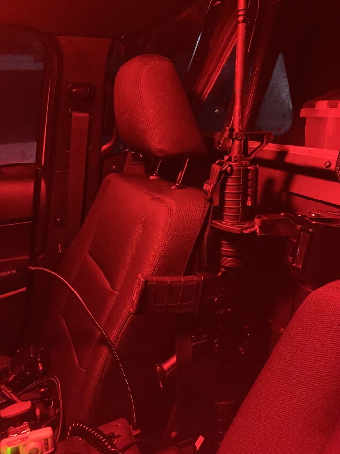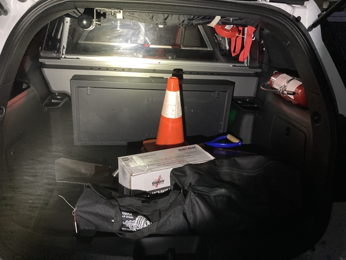 Багажник. Все что на фото- было уже в комплекте с машиной. Цепи на колеса, сигнальные/ аварийные факелы, три оранжевых конуса, лопата ( будет заменена складной лаперной сопаткой ), огнетушитель, и под крышей виднеются шипы. Справа в верхнем левом углу - «пушка» заднего радара. Черный ящик за сиденьем- провода и электроника. Сюда еще придется укладывать тяжелый броник, шлем, противогаз, файлы с бумажками, экип на случай дождя/ снега, сменку и прочее. У каждого авто есть hard drive, на который пишут обе камеры и микрофон. В моем дивизионе, дата с него списывается дистанционно и автоматически, в дивизионах поменьше, приходится делать это вручную.