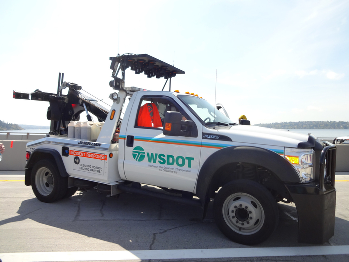 На фото ниже наши самые большие помощники- работники Департамента Транспорта. Они, так же как и патрульные полицейские, циркулируют по магистрали и выполняют массу работ: от заправки галлоном бензина авто человека, у которого он случайно закончился, до перекрытия трассы во время аварии. На грузовиках видны специальные щиты с программируемым таблом и стрелками. Эти люди также очищают трассу от всевозможного мусора, избавляются от пролитых химикатов, могут эвакуировать авто в безопасное место, накачать или заменить колесо и произвести некоторые ремонтные работы как пострадавших авто так и трассы. Самая же бесценная помощь- просто перекрыть движение в полосе, где офицер ведет расследование аварии.