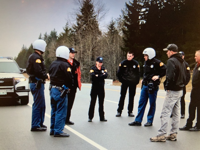 Я писал в предыдущих постах, что у Патруля, ровно как и в других агентствах есть великое множество специальностей. От специальности мотоциклиста, спецназа ( SWAT ), летчика, детектива, до К9, сапера, группы быстрого реагирования, оружейника и т.д. В зависимости от популярности той или иной специальности, чтобы получить такую позицию нужно либо попасть в «струю», когда спецов не хватает, либо ждать годами, пока появится вакансия. Скажем, такие специальности как DRE ( эксперт по распознанию наркотиков ) или группа быстрого реагирования (RDF) всегда нуждаются в кадрах и попасть туда можно сразу после выпуска из академии просто написав заявление и пройдя обучение. Стать детективом или получить специальность сапера- практически невозможно, потому что специальности единичные, и получив такие- народ обычно остается там до пенсии или повышения. У каждой специальности есть свой процент надбавки к зарплате. Если ваша специальность инструктор по вождению ( EVOC instructor) или FTO ( field training officer), то получать надбавку вы будете только тогда, когда тренируете кадетов. Во всё остальное время, вы работаете в своем взводе и выполняете обязанности обычного трупера. В начале лета 2022 я подал заявку в группу быстрого реагирования. Долго ждать не пришлось из- за острой нехватки народа- приняли сразу. Огромный плюс любой специальности- возможность заниматься не только нарушителями на дорогах, а делать другую работу. RDF - это такой полицейский МЧС. В основном работают с протестами, парадами, перекрытием и контролем магистрали в случае стихийных бедствий и прочее. Единственный, кмк, минус- огромное количество доп оборудования, которое приходится возить в патрульной машине. Ну и постоянная часовая готовность вылететь на ЧП во всеготовности. Таких вызовов у меня за год было два. Один - протест, перекрывший магистраль, второй- протест перекрывающий въезд на базу ВМФ. В основном мы о протестах знаем заранее, и командование дает нам знать к чему готовиться. Фото ниже- в полной экипировке RDF во время обучения. Я справа и мне еще на момент фото не выдали RDF броник и противогаз с коммуникатором. Пришлось тягать тяжелый броник и обычный противогаз.