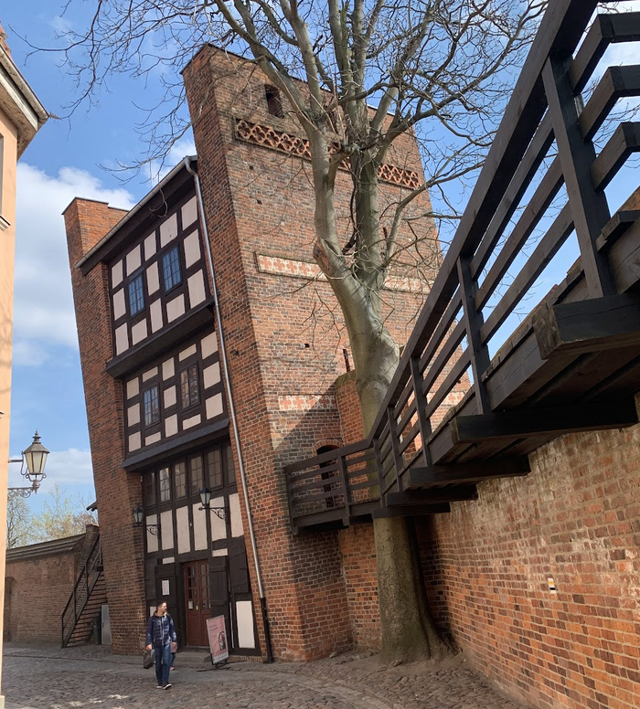 Это было давно, когда в Торуни правили тевтонские рыцари. Поскольку они были членами рыцарского ордена, они должны были соблюдать его правила. Одним из них был запрет на встречи с женщинами. Но один из тевтонских рыцарей, по имени Хугон, встретив необыкновенно красивую жительницу Торуни Барбару, безумно влюбился... Что ж... сердце не слуга, поэтому он нарушил это важное правило. Горожанка и тевтонский рыцарь встречались на городских переулках, пока их не увидели горожане. Сочтя поведение влюбленных возмутительным, они решили сообщить о них городскому совету и командору Тевтонского ордена в Торуни. Состоялся суд, в ходе которого оба были признаны виновными, поэтому и Барбара, и рыцврь должны были понести наказание. Женщину приговорили к пятидесяти ударам плетью и отправили в монастырь в Хелмно, где ей предстояло провести остаток своей жизни. А тевтонский рыцарь, как говорят, построил падающую башню, поскольку его совесть, то есть его поведение, было кривым. Он строил и строил много десятилетий, а когда положил последний кирпич, умер от истощения и переутомления.