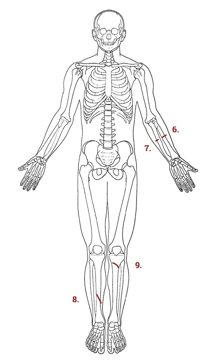 Точно датировать время смерти воина сложно, авторы исследования дают диапазон 1250-1350 годы [4]. Ему было от 25 до 30 лет, рост составлял 162,7 см (+/- 4,31 см) – парень был несколько ниже, чем готландские ополченцы, средний рост которых колебался около 168 см. Вот собственно места повреждений конечностей нашего героя: