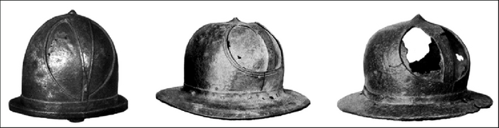В массовых захоронениях, хотя и были профессионалы, но все же не самая богатая часть (павших вельмож увозили с собой), а значит и денег у них было не так много, поэтому качество шлемов действительно могло быть посредственным. Отсутствие травм непосредственно на скелете объясняется, видимо, использованием щитов, которые в сочетании с доспехами (или даже без них) делали корпус невыгодной целью.