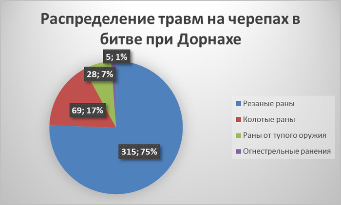 Кроме того, отчасти мы имеем дело с ошибкой выжившего (в нашем случае умершего) – травмы в мягких тканях мы не увидим, только те, что оставили следы на костях, поэтому возможно часть воинов имели раны живота. Но опять-таки даже те захоронения, которые мы явно не можем сопоставить с какой-либо битвой [9, 11] имеют все тот же перевес в сторону ударов в голову и, видимо, нанесенных преимущественно в пешем бою.
