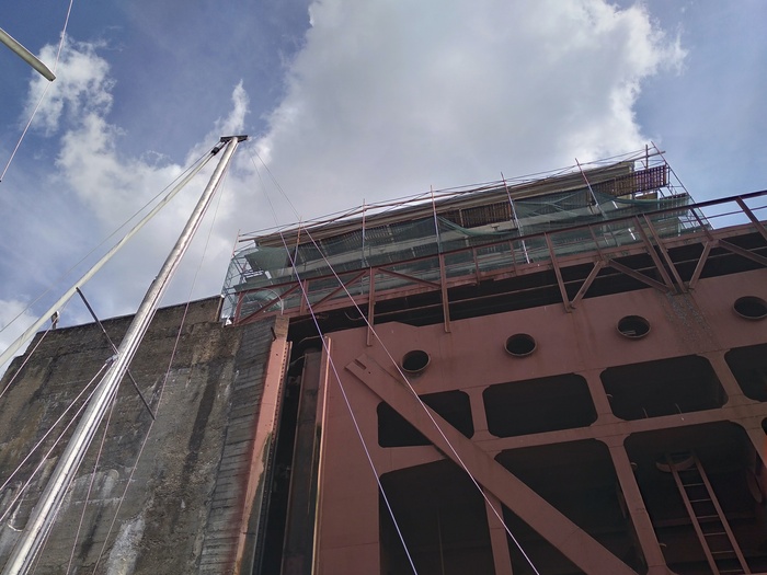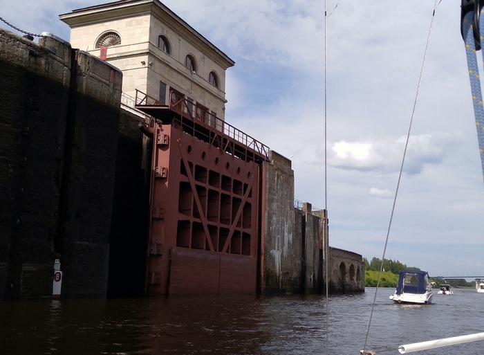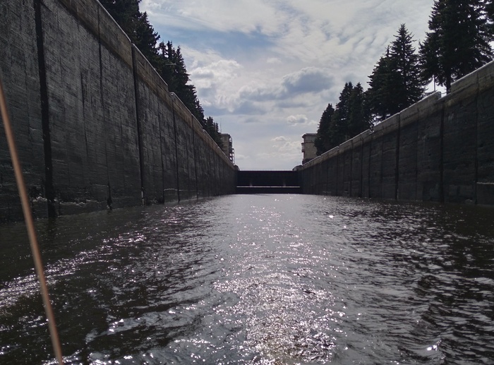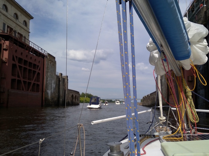 Заходим в камеру последними, начинается суета - что-то у "Окского" идет не по плану, и он никак не может ошвартоваться. Девушка-диспетчер выгоняет нас из камеры, чтобы не мешались большим железным пароходам. Ждем повторного приглашения, которое вскоре и получаем. Быстро швартуемся. В последний момент заходит еще моторный катер, ждем, пока ошвартуется и он. Шлюзовка проходит спокойно, но по ее окончанию меняют порядок выхода, и мы выходим перед "Окским".
