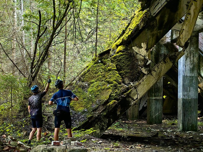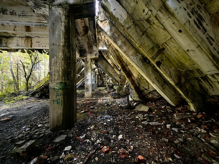 Мы планировали попасть на фабрику с другого берега, но от остатков моста ничего не осталось, тропинок тоде не было, пришлось объезжать с другой стороны. Конструкции фабрики почти не видно издалека, всё скрыто в зелени