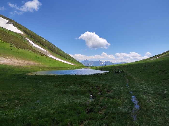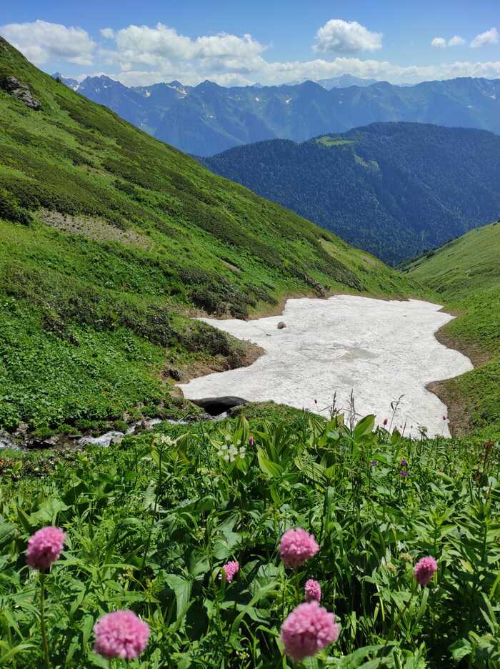 Мощным снежным мостом на небольшом ручье. Цветущими лугами. И далеким-далеким лесом внизу...
