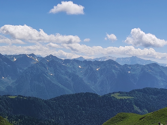 С перевала на Юг, на спуск, в сторону Красной Поляны, открываются впечатляющие панорамы окрестных гор.