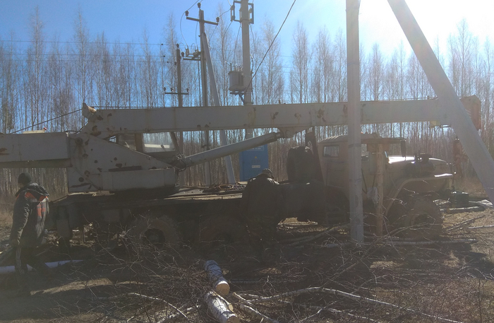 Не думал, что серия «Распутица» продолжится.. Но, тем не менее, это случилось. Стадо долбоебов в начале апреля приехало менять изоляторы на столбах и проводить еще какое-то там обслуживание. Так как земля пропитана водой, владелец участка (то есть автор текста) им сразу пояснил — отсыпанную и наезженную им дорогу использовать запрещает. В случае чего — пробьет колесо, вызовет полицию и представителей администрации, чтобы засвидетельствовать порчу частной дороги, и получит потом с этих дятлов, как с полноценных. Работяги покрутились на своей буханке, и загонять на просеку под линию (где стояли глубокие лужи чуть не по колено, и нога в сапоге уходила в грязь так, что легко можно было проебать там сапог) спецтехнику в виде какого-то несерьезного грузовичка с люлькой (на базе Газели) не решились. Застрял бы, болезный, к гадалке не ходи. О чем-то думали, совещались, звонили начальству. Напоследок погрозились — вот мы ужо завтра приедем с вездеходом, он везде проедет, и на хуй нам твоя дорога не усралась. «Ну-ну», сказал скептичный владелец участка. И стал с нетерпением ждать завтрашнего дня. На следующий день лил лютый дождь, поэтому, само собой, не приехал никто. Как всегда, работяги наебали, появились через день. Со спецтехникой в виде автокрана на базе трехмостового УРАЛА. Вот он, собственно.