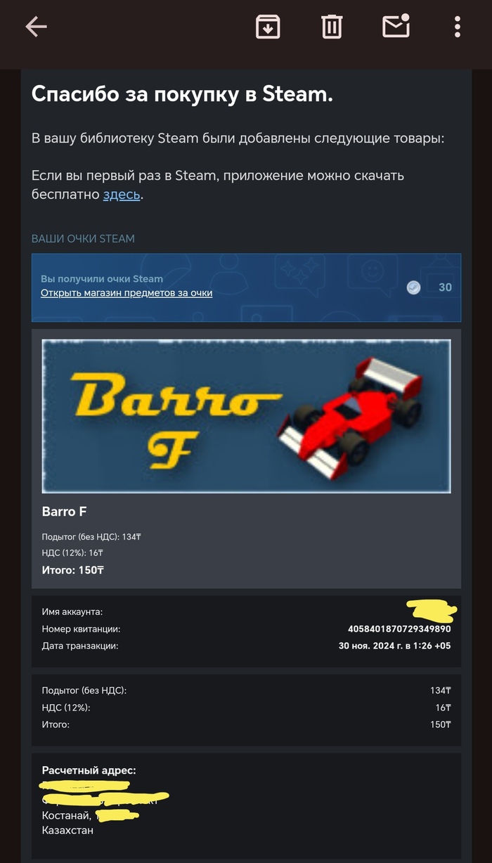 И тут мне приходит на почту это письмо! (Чтобы привязать карту региона, надо совершить дешёвую покупку, это в районе 21 рубля, ну в тенге видно на скрине сколько). 28 ноября пришло "извините блабла не получилось", а вот теперь получилось!