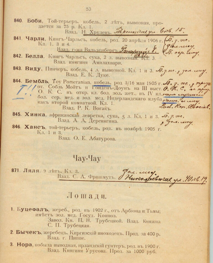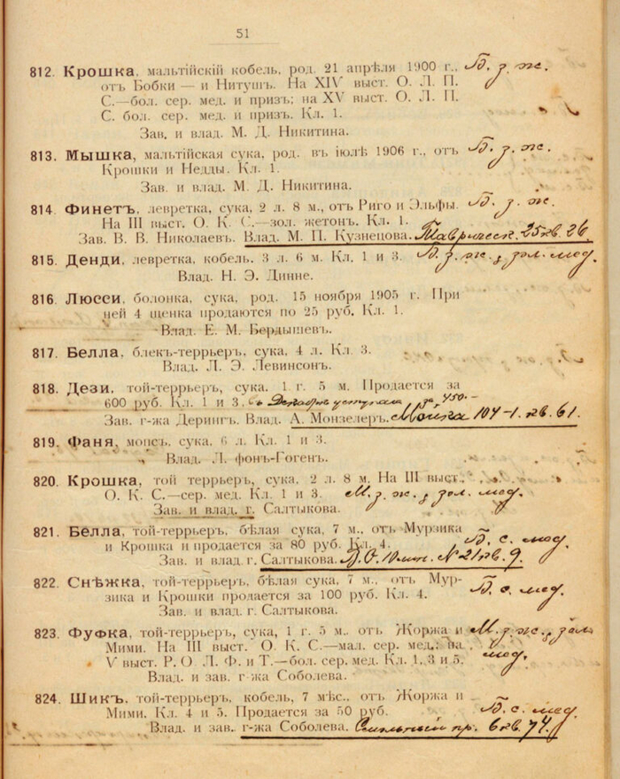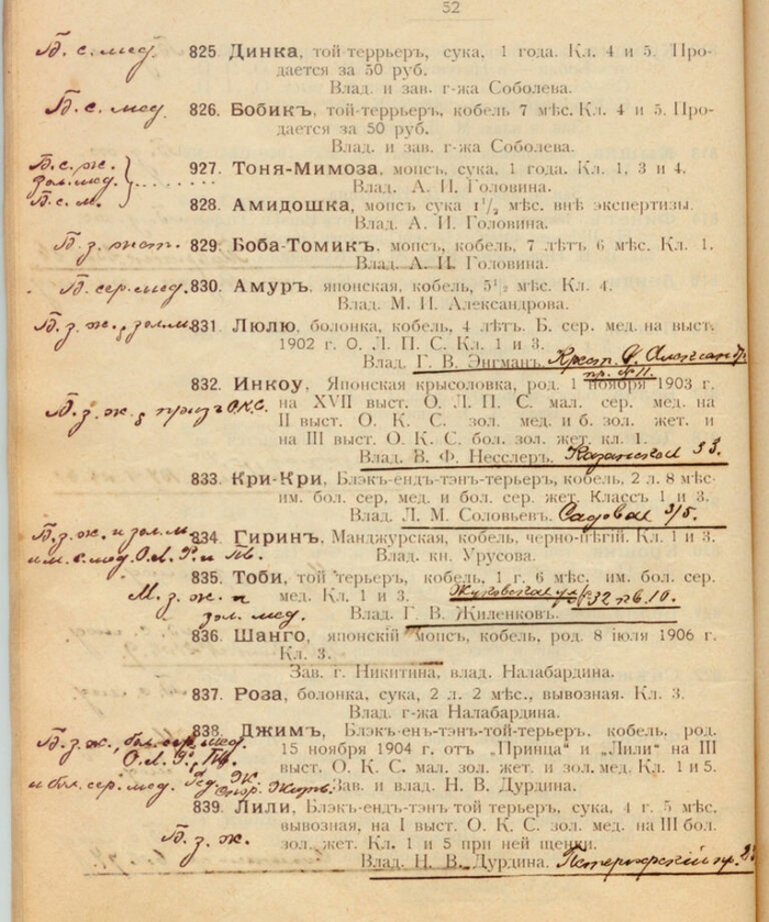 На фоне прочих пород - очень много той-терьеров. И у некоторых указан окрас... белый :) Сейчас, напомню, в стандарте русского тоя белый или пятнистый окрас отсутствует. Также мы видим несколько загадочных зверей - японская крысоловка (вероятно что-то вроде современного японского терьера, но это и сейчас диковинка из диковинок) и манджурская (неведомый зверь, следы которого мне найти пока не удалось).