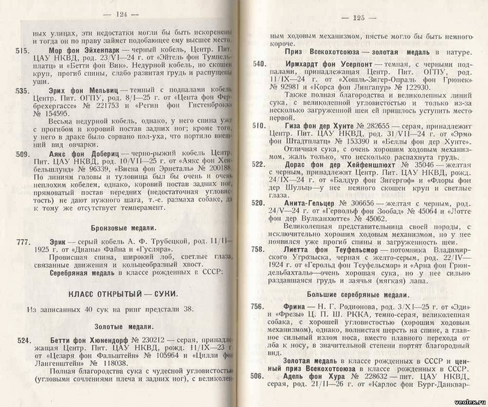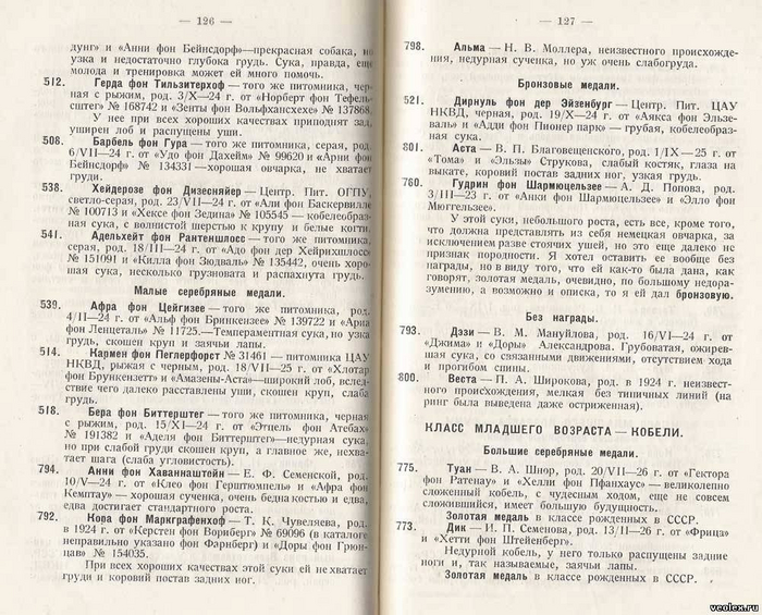 "У этой суки, небольшого роста, есть всё, кроме того, что должна представлять из себя немецкая овчарка, за исключением разве стоячих ушей, но это еще далеко не признак породности. Я хотел оставить ее вообще без награды, но в виду того, что ей как-то была дана, как говорят, золотая медаль, очевидно, по большому недоразумению, а возможно и описка, то я ей дал бронзовую"