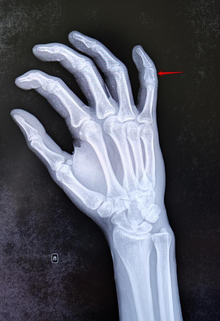 В анамнезе у молодого пациента травма-падение на улице, с последующим обращением в травмпункт, где был диагностирован перелом дистального конца левой лучевой кости без значительного смещения, была наложена гипсовая лонгета 3х месячной давности.